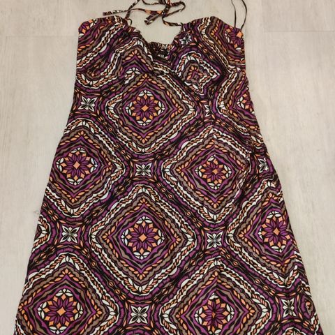 Vaaleanpunainen uudenveroinen vartalonmyötäinen mekko. Niskan taakse solmittavat narut. Ellos BASICS.