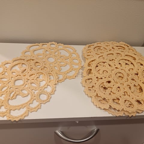 Kappa, jossa virkattu reunapitsi. Kankaan max.leveys noin 250cm. Korkeus reunasta 85cm, keskeltä 45cm.