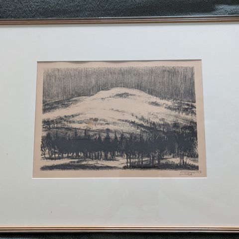 Aukusti Tuhkan litotyö.Koko kehyksineen 47cm x 51cm. Musta kehys lasilla.