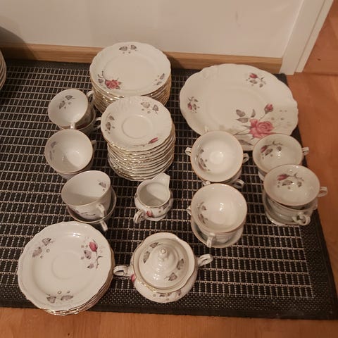 Astiasto on vanha, vähän käytetty ja hyväkuntoinen. Ainoastaan parissa kupissa pieniä säröjä (kts.kuvat), mutta kupit siitä huolimatta käyttökelpoisia. Sisältää: