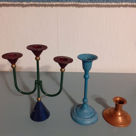 Kuvien mukaiset kynttilänjalat runko puuta, yläosa mahdollisesti messinkiä. Toinen messinkiosa on hieman eri muotoinen kun toinen, ilmeisesti kolahtanut joskus johonkin ja muoto muuttunut. Saa mahdollisesti taivuteltua takaisin muotoonsa. Oletan että nämä ovat 1930- tai 1940-luvulta mutta en ole varma.