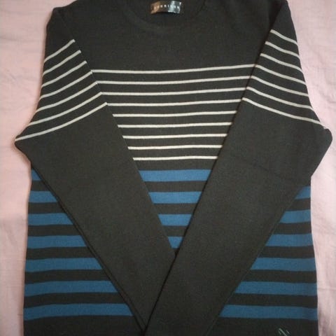 Kuvan hyvin vähän käytetty, hyväkuntoinen ja laadukas raidallinen (tummanharmaa / turkoosi) Stockmannin V-kauluksinen villapaita. Koko voi hieman valehdella, sillä sopii minulle vaikka käytän tavallisesti L-kokoa. Meillä ei tupakoida eikä ole kotieläimiä.