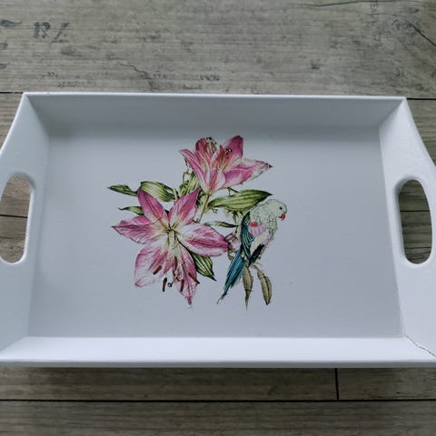 Musta valkoinen tarjotin tekstillä, jotain käytön jälkiä löytyy, ei ole uusi.
