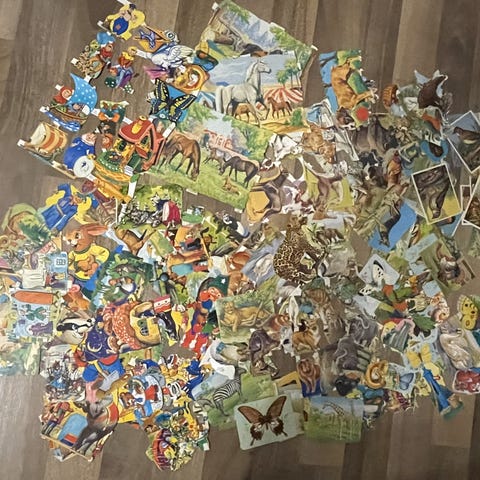 Kiiltokuvia kansiossa ja muutamia pussissa. Kerätty 1980-1990 luvulla.