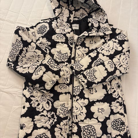 Tikatussa, topatussa Marimekko Judit-takissa on Pioni-kuosi.