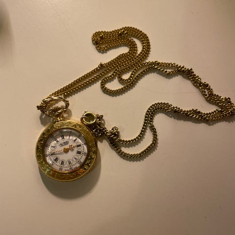 Kello toimii hienosti ja on hyväkuntoinen. Uudesta ei kuitenkaan ole kysymys, joten kellon lasi on hieman hankautunut käytössä, joskin on yleisilmeeltään siistikuntoinen. Ripustusketju on hieman kuluttanut nupin ympärillä olevan ripustuslenkin kultausta.