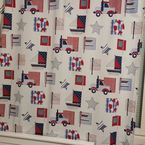 Ompelijalla teetetty lastenhuoneen sivuverho. Verhon mitat ovat pituus 246 cm ja leveys 136 cm. Verhojen yläosassa rypytyskuja. Alasauman sisällä verhopainot, että laskeutuvat ryhdikkäästi. 100% puuvillaa. Ihana kuosi.