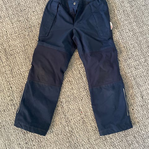 Uutena ostetut ja yhdellä lapsella käytössä olleet Reiman vaaleat, vuorelliset välikausihousut kokoa 128 cm. Mittoja: haara-lahje 58 cm ja vyötärö-lahje 84 cm. Vyötäröllä säätömahdollisuus. Kätevä vetoketjutasku ja kaksi sivutaskua. Polvissa vähän piinnttynyttä likaa ja toisen lahkeen reunan kangas kulunut rikki, muuten siisti ja edelleen käyttökelpoiset housut.