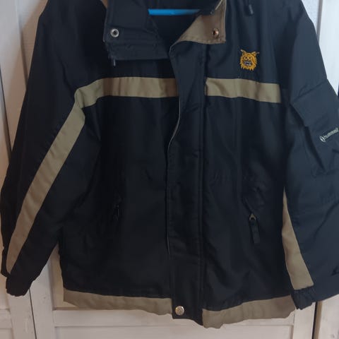 Hummelin ihanan näköinen toppatakki. Musta pohja missä pieniä pisaran muotoisia pinkkejä palloja. Takissa kulumia päällimmäisessä kankaassa, mutta muuten todella hyvässä kunnossa.