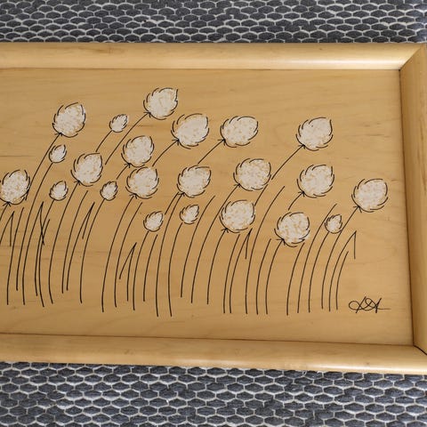 Aarikka tarjotin, Niittyvilla, leveys 52cm+kahvat, korkeus 35cm. Nouto tai postikulut ostajalle. Toridiili ei käytössä.