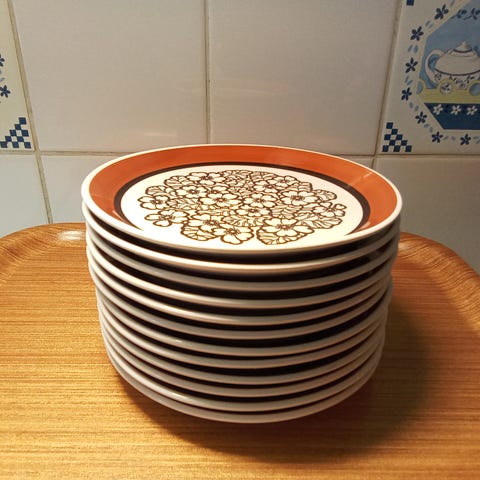 Uudenveroiset Greta Liisa Snellman-Jäderholmin suunnittelemat pullalautaset -28-32 luvulta. Leveys 16,6cm. Kultaukset ym. täydellisessä kunnossa. 3e kappale.