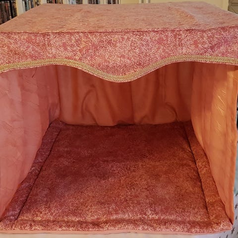 Settiin kuuluu häkin sisälle verhot, kattokangas, pehmeä alusta, häkin etualan verhot tampeilla.