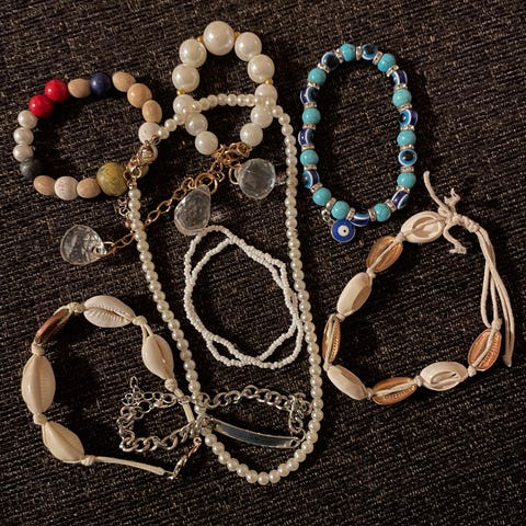 Punavalkoinen puuhelmistä tehdyt kaula- ja rannekoru. Värikäs kukkanmallisia puuhelmiä sisältävä kaula- ja rannekoru. Yhteishintaan 2€