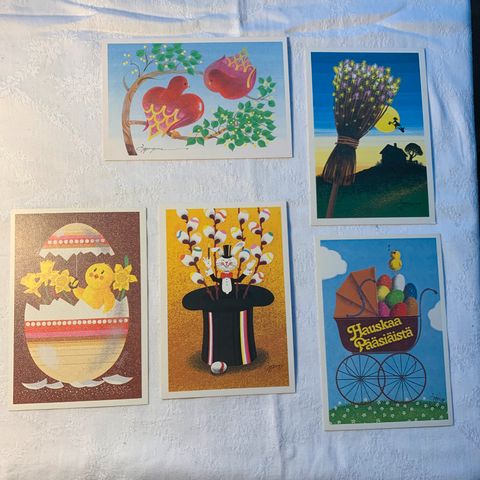 Neljä upeasti kuvitettua pääsiäiskorttia 80-luvulta. Ainakin kolmen kortin kuvittanut Omppu Omenamäki, yhdestä en saa selvää (noita-akka luudalla).