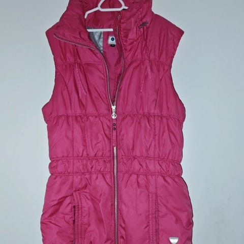 Hupullinen Luhdan kevyttoppaliivi koko 34 tai XS. Etupuolella toppauksen alla piilossa taskut molemmilla puolilla. Väritys: kullan ruskeat toppaosat ja valkoiset softshell osat.