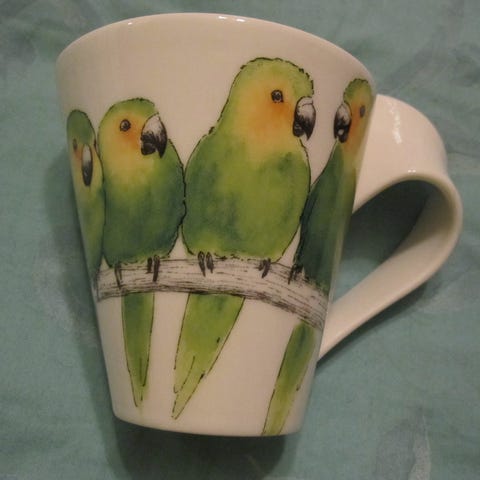 Lasten muki, reunan kuvissa lammas, possu ja kana. Ihastuttava muki. Täysin ehjä ja hyväkuntoinen.