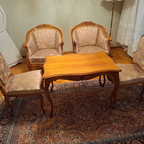 * Hakusanat: Ranskanrokokoo, tyylikaluste, 60-luku, nojatuoli, tuoli, sohvapöytä, pöytä, olohuone, sisustus *
