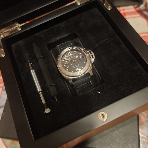 Tarjolla upea titaani Panerai PAM00025. Mukana alkuperäiset paperit 5/2002, boksi ja nippu tositteita huolloista. Viimeisin huolto 1/25 virallisessa Panerai huollossa ja sillä 2 vuoden takuu.