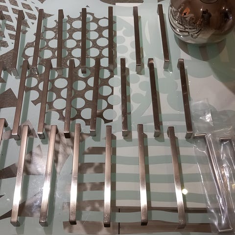 Käytöstä poistettuja tammisia kaapin vetimiä noin 10 kpl. Kahvan reikien väli noin 10cm. Itse kahvan pituus noin 11,5cm.