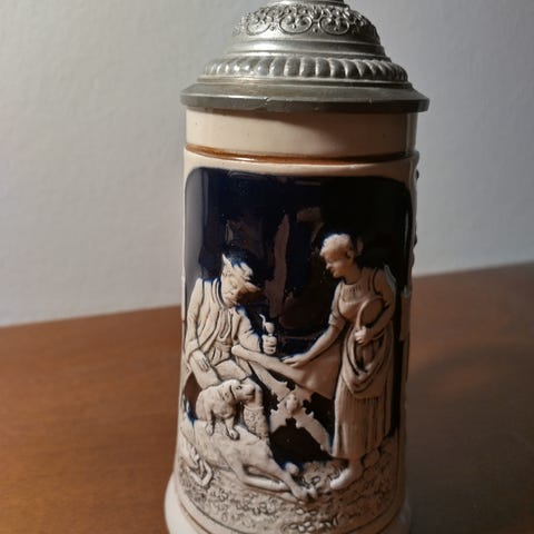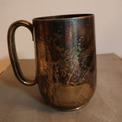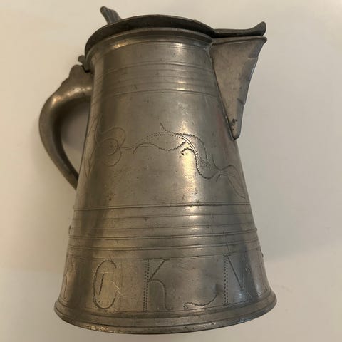 Vanha tuoppi, tinaa? Kaiverrukset näkyvät kuvissa. Mitat noin 13x10cm.