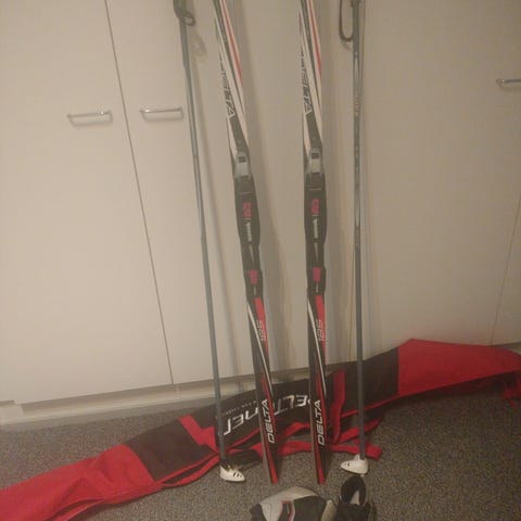 Settiin kuuluu sukset ja sauvat. Suksien pituus on 201 cm ja sauvojen pituus 145 cm. Toisen sauvan muovisuojus on rikki (näkyy kuvassa), mutta se ei vaikuta käyttöön tai suorituskykyyn.