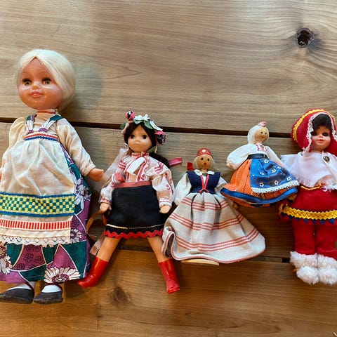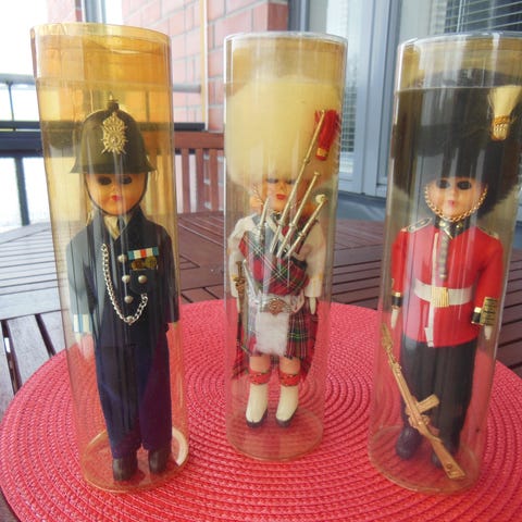 Myydään viisi hyväkuntoista matkamuistonukkea Britteinsaarilta. Nouto tai postitus. Kaikki yhteensä 5 e.