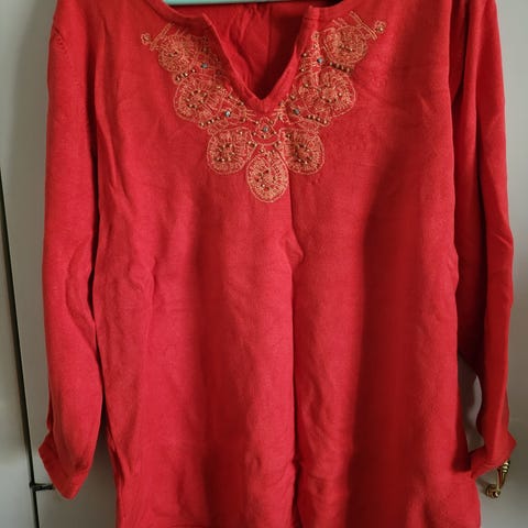 Oranssi ohut ja lyhyehkö neule kevääseen. Yläosa pitsinen edestä ja takaa. Hihat on 3/4 osaiset. Myyn sellaisessa kunnossa kuin on.
