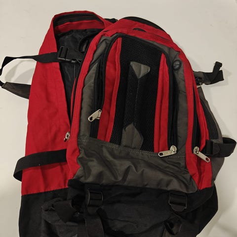 Ruotsalainen, Stadium AB -merkkinen reppu; korkeus 47 cm ja leveys 39 cm ja pohjan leveys 15 cm. Sisällä iso tasku ja ulkopuolella 2 pienempää taskua, nahkasolki. Repun kiinni ollessa turkoosia väriä ei näy yhtään. Hinta 10 euroa.