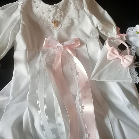 Klänning, band, hatt, duk för att torka huvudet, spetsstrumpor med blå rosetter, allt totalt 78 e
