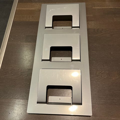 Metallinen lehtiteline, 5 tasoa. Korkeus 78 cm ja leveys 23,5 cm.
