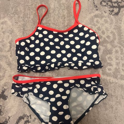 Kivat bikinit kesään. Koko 140/146. Tummansininen pohjaväri, jossa punaiset raidat ja valkoiset pallot. BOGI.
