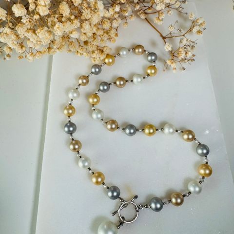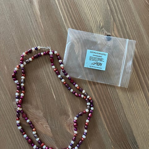 Aidoista viljellyistä makeanveden helmistä kaulakoru. Lukko hopeaa. Aitoustodistus ja arvioitettu kultasepillä, myös hinta (myyn nyt hieman alle arvioidun hinnan). Kokonaispituus 50 cm.