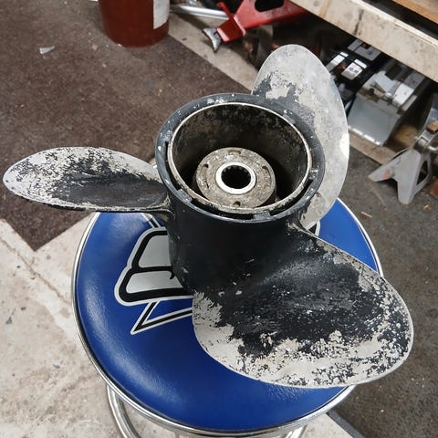 Messinki potkuri, leimassa merkintä 16 Häccqvist 12 (halkaisija 16", nousu 12"). Akselivahvuus 40mm, kartion pituus 80mm, mutterin päässä halkaisija 35mm ja kiilauran leveys 10mm. Löytyy Lyttylästä, kulkeutuu Satakunnan alueella helposti.