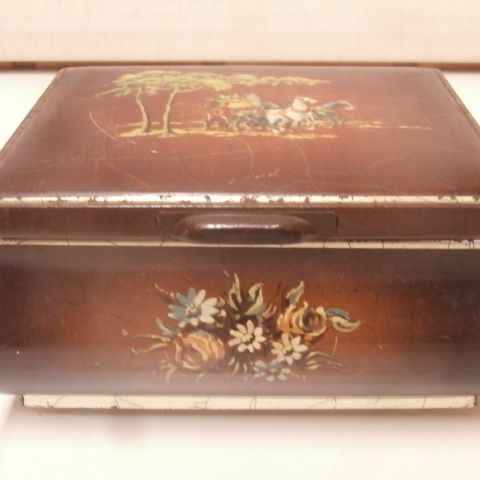 Vanha kaunis peltirasia, kannessa fasaaneja, kukkia ja pensas. Reunoissa kullanväriset juovat. Kukkia laidoilla. Pohja on hauskasti leveämpi kuin kansi. Valitettavasti se on melko kulunut, mutta kansipuolen kuvat ja värit ovat hyvin säilyneet. Vanha englantilainen rasia. Sisus kullanvärinen ja siisti. Korkeus 5 cm ja halkaisija 12 cm. Postitus tai nouto.