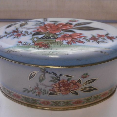Kaunis vanha viininpunainen peltirasia, kansi valkeapohjainen, iso kukkakimppu keskellä. Reunoissa kullanvärisiä koristeita, samoin kannen reunassa. Korkeus 8 cm, halkaisija 21 cm. Pinnalta melko siisti, pieniä käytöstä tulleita jälkiä, sisällä muutama ruosteinen kohta. Ulkopohjassa teksti: Baret ware, Container, made in England. Postitus tai nouto.
