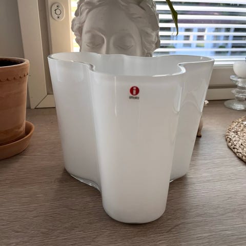 Iittalan Aalto maljakko 120 mm. Maljakon 'takasivulla' hennon hento kosketusrantu (kakkoskuva), joka näkyy vain, kun katsoo maljakkoa alaviistosta. Muuten maljakko aivan loistokunnossa, on aivan kuin uusi.