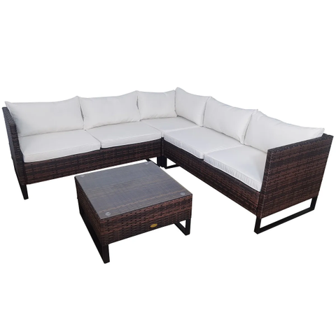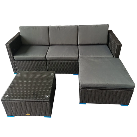 Toimitus sisältää: 2 x sohvapalasta, 1 x kulmapala 1 x pöytä turvalasilla, pehmusteet