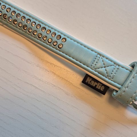 Pienen koiran 25 cm pitkä ja 1,2 cm leveä solkipanta missä on kahdeksan "timanttia". Aitoa nahkaa. Valmistettu Suomessa. Ei käytetty.