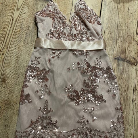 Vila paljettimekko, koko XS. Suora malli, hartiat 37 cm, pituus 84 cm. Paikoin paljetteja lähtivät irti (kuvassa), mielestäni se on melkein huomaamaton.