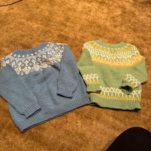 Vihreä ja sininen käsinkudottu villapaita, toinen uusi 104-116 cm