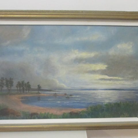 Mökki ranta ja vene aihe. Maalattu öljyvärikynillä? ei varmaa tietoa. Tekijän, taiteilijan signeerauksella, Korkeus 31cm ja leveys 22cm. Puukehykset. Lasi päällä. Alennettu hinta.