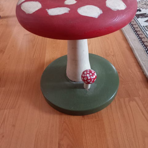 Elämää nähnyt, mutta tosi napakka sienijakkara. Istuinosan halkaisija 23cm, jalan halkaisija 18cm, koko korkeus 27cm.