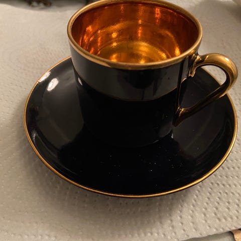 Kultaraita kaj Frank mokkakupit arabia.11kpl kuppeja ja lautasta. Kupin korkeus 4,3cm halkasia noin 6,5cm lautasen halkasia 11,5cm.pohjassa lasituksen päällä made in finland.3 lautasessa arabian leimalla.1 lautasessa särö.