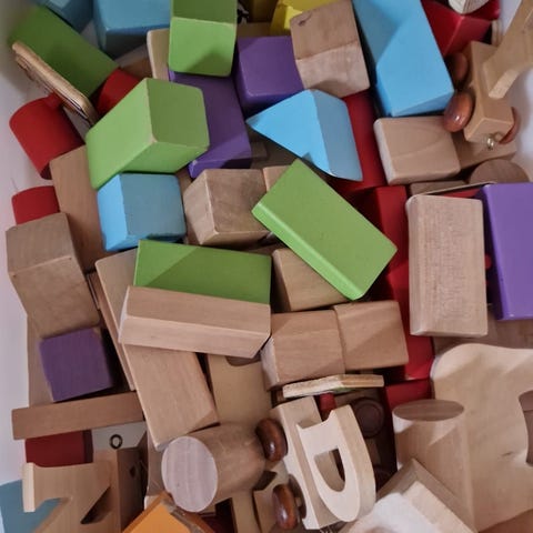 Puu- ja muovipalikoita rakenteluun.
