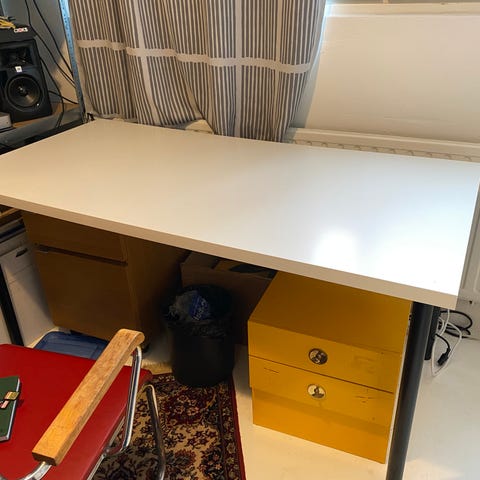 Ikean pöytälevy 150cm x 75cm, kaksi jalkaa (korkeus 70com +pöytälevyn vahvuus 3,4cm= pöydän korkeus). Toiseen päähän tulee hyllykkö, johon saa sijoitettua esim. tietokoneen. Kuva lisätty. Malli poistunut, mutta ovh kokonaisuudelle ollut n. 140,- (+ - 10,-). Erittäin siisti, eli kunto hyvä, vähän käytetty. Toisessa päässä pöytälevyä muutama alle nuppineulanpään kokoinen painauma, joita ei kauemmaksi huomaa. Haku Porvoosta tai Kumpulasta Helsingistä.