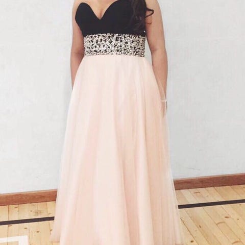 Ollut n 170cm pitkällä S-M kokoisella, tanssittu tennareilla. Nyöritys selässä. Pukupussi ja vannahame halutessa mukaan.