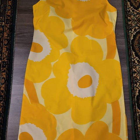 Marimekon "Truba Pieni Unikko 2" -kotelomekko. Vain kerran eksynyt päälle, joten kunto moitteeton. Hihaton, vetoketju selässä, kokovuori. Sivusaumoissa taskut. Kangas ei jousta. Kai-kai noin 49 cm, olka-helma noin 93 cm. Nouto mahdollinen Turusta.