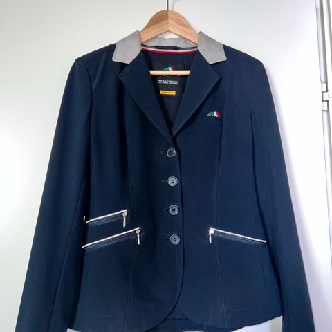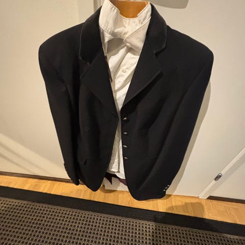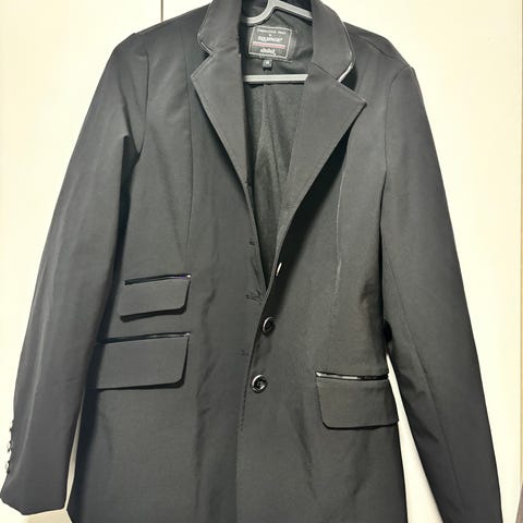 Cavallon siisti vain paristi käytetty musta kisatakki. Koko 16 (USA), vastaa Suomen 44-46. On kuitenkin mielestäni naftia kokoa ja vastaa enemmän 42-44. Hihoja lyhennetty (käännetty sisään) siististi ja hihojen napit on ommeltu muutamalla tikkauksella kiinni hihaan. Saa helposti purettua lyhennyksen. Varanappi mukaan. Olkapää-helma mitta 65cm. Kainalo-kainalo mitta 50cm. Kangas joustaa hieman.