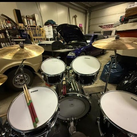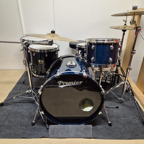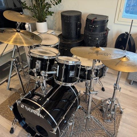 Akrylset, tillverkat i Tammerfors. 26, 14, 16, 18 plus stativen som syns på bilderna. Påsar till trummorna. Virveln och bastrumspedalen ingår inte.