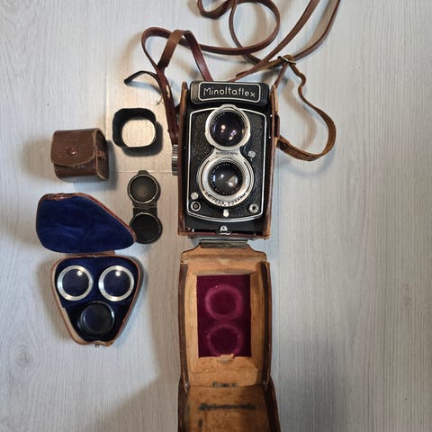 Manual focus TLR camera made by Minolta introduced in 1961. It has a 75mm f3.5 Chiyoko Rokkor lens as a taking lens in an Optiper-MVL shutter. Easy to use one-hand operation with a focusing lever located on the bottom. Die-cast aluminum body.
